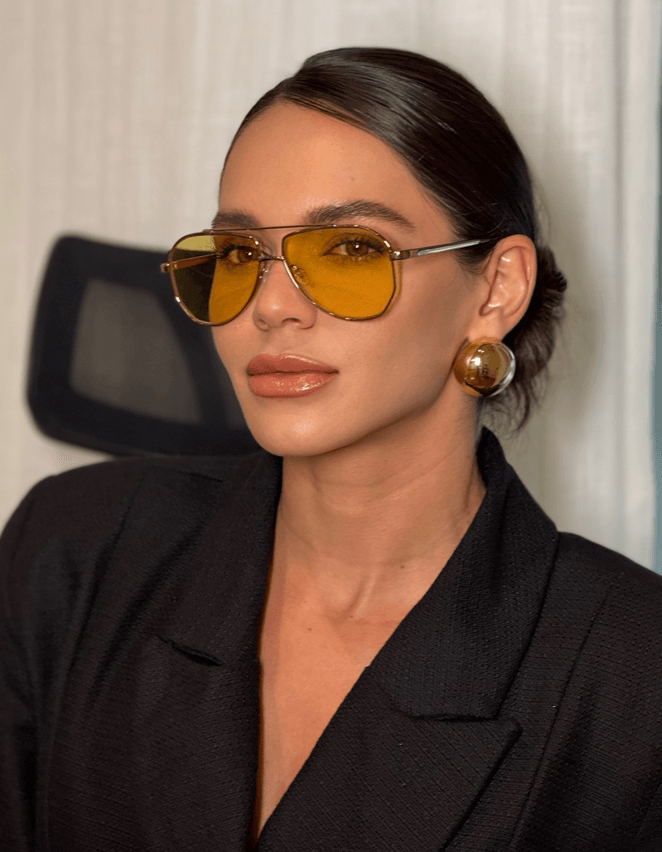 Óculos de sol produzido no Brasil, modelo aviador todo em metal na cor dourado, com proteção uv400 permanente nas lentes. *Metal: Dourado *Lente: Amarela (sem espelhado)