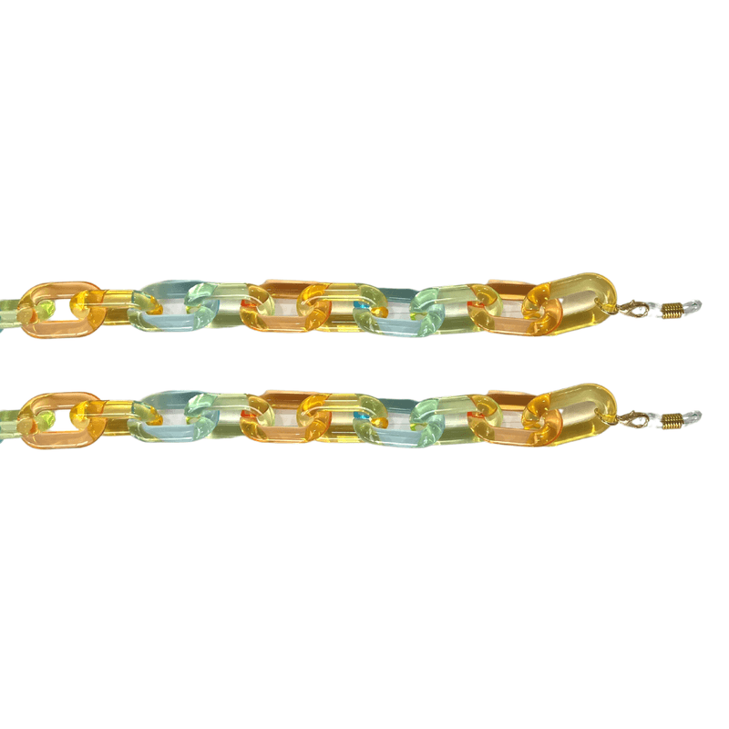 Corrente feminina desenvolvida em material resinado, possui um efeito transparente. As extremidades possuem elo para a haste do óculos.