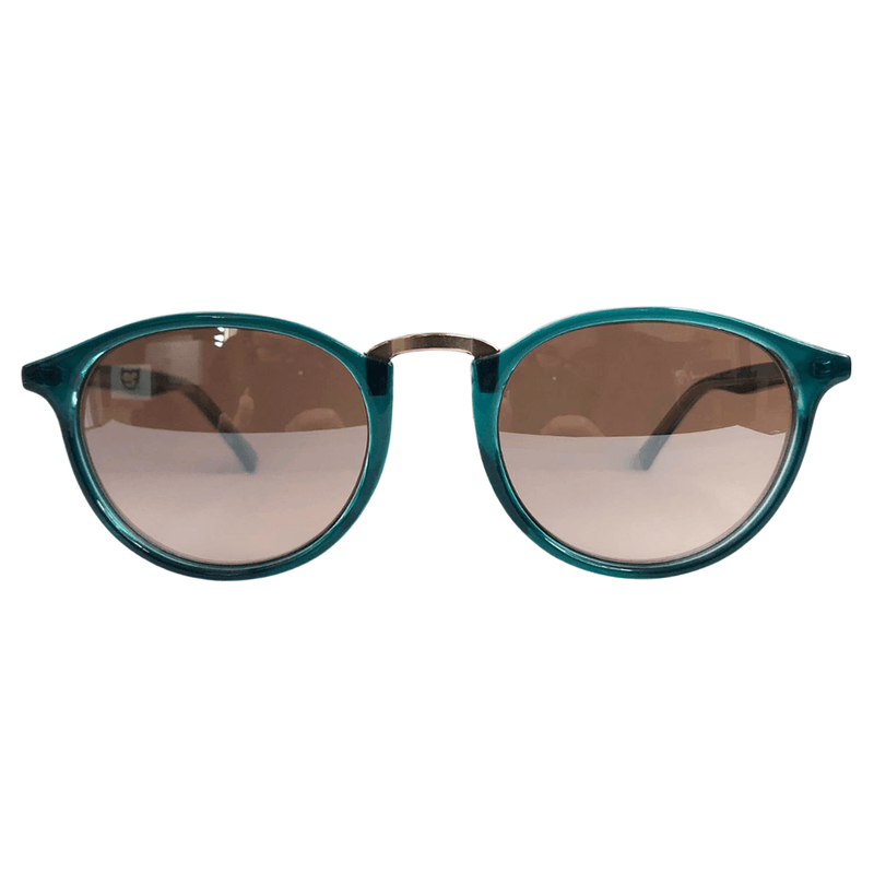 Modelo com design atemporal, redondo trazendo um traço de metal na ponte. Produzido por inteiro em acetato italiano e pintado a mão na cor verde capri, acompanhado de lentes em tom castanho claro espelhado com proteção UV400 permanente.