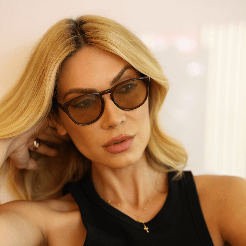 Óculos de sol com armação em acetato italiano e lente fotossensível com proteção UV400 permanente nas lentes.